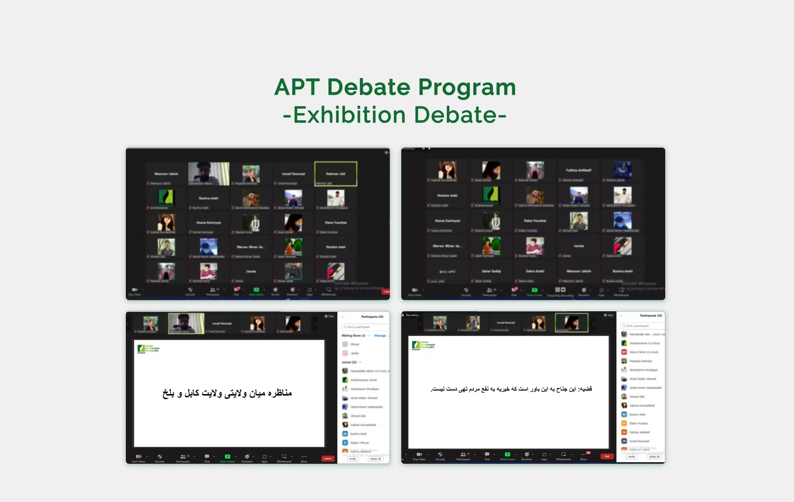 Over the past quarter, APT team has organized four online Exhibition Debate rounds between